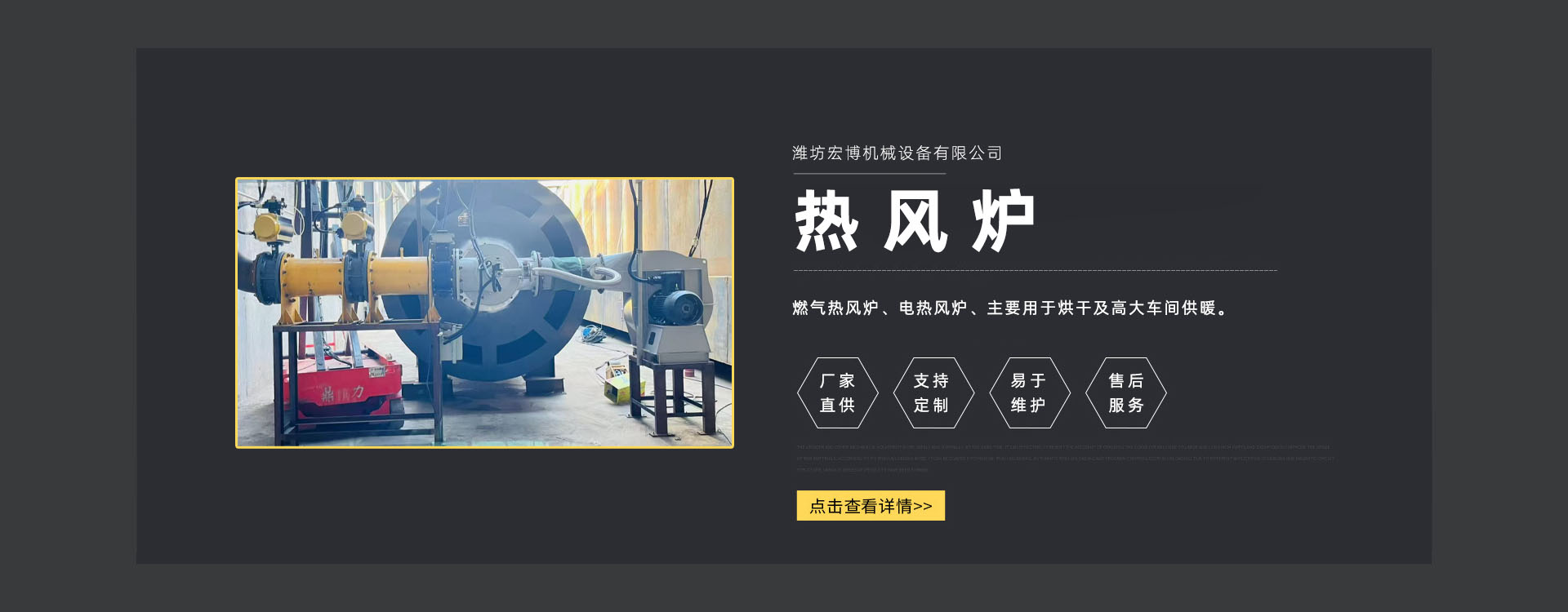 濰坊宏博機(jī)(jī)械設(shè)(shè)備有限公司是從事熱風(fēng)(fēng)爐、烘干設(shè)(shè)備、供暖設(shè)(shè)備的研發(fā)(fā)、設(shè)(shè)計(jì)(jì)、制造和服務(wù)(wù)于一體的實(shí)(shí)體企業(yè)(yè)。長(zhǎng)(zhǎng)期以來(lái),企業(yè)(yè)以市場(chǎng)(chǎng)的發(fā)(fā)展和客戶的需求為導(dǎo)(dǎo)向,集多年的生產(chǎn)(chǎn)技術(shù)(shù)與經(jīng)(jīng)驗(yàn)(yàn)為一體,不斷開(kāi)發(fā)(fā)和優(yōu)(yōu)良產(chǎn)(chǎn)品。